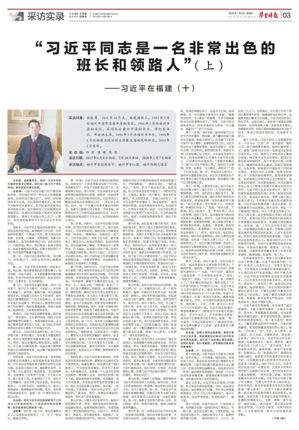 總的來說,習(xí)近平同志確實(shí)是一名非常出色的班長(zhǎng)和領(lǐng)路人。他當(dāng)福州市委書記的時(shí)候,不僅卓有成效地領(lǐng)導(dǎo)了福州經(jīng)濟(jì)社會(huì)全面發(fā)展,也在加大扶貧力度、重視輿論宣傳、關(guān)心干部、關(guān)心老同志、貼近群眾、關(guān)注弱勢(shì)群體、支持部隊(duì)工作等各個(gè)方面,下了很大功夫,做了很多工作。在他領(lǐng)導(dǎo)下工作,我們不僅心情愉快,而且學(xué)到了很多東西。很多同志都表示,與習(xí)近平同志一起的那幾年,是自己提高最快、做事情最多的時(shí)期?,F(xiàn)在,我經(jīng)?;叵肫鹉嵌螝q月,他的一言一行都?xì)v歷在目,難以忘懷。